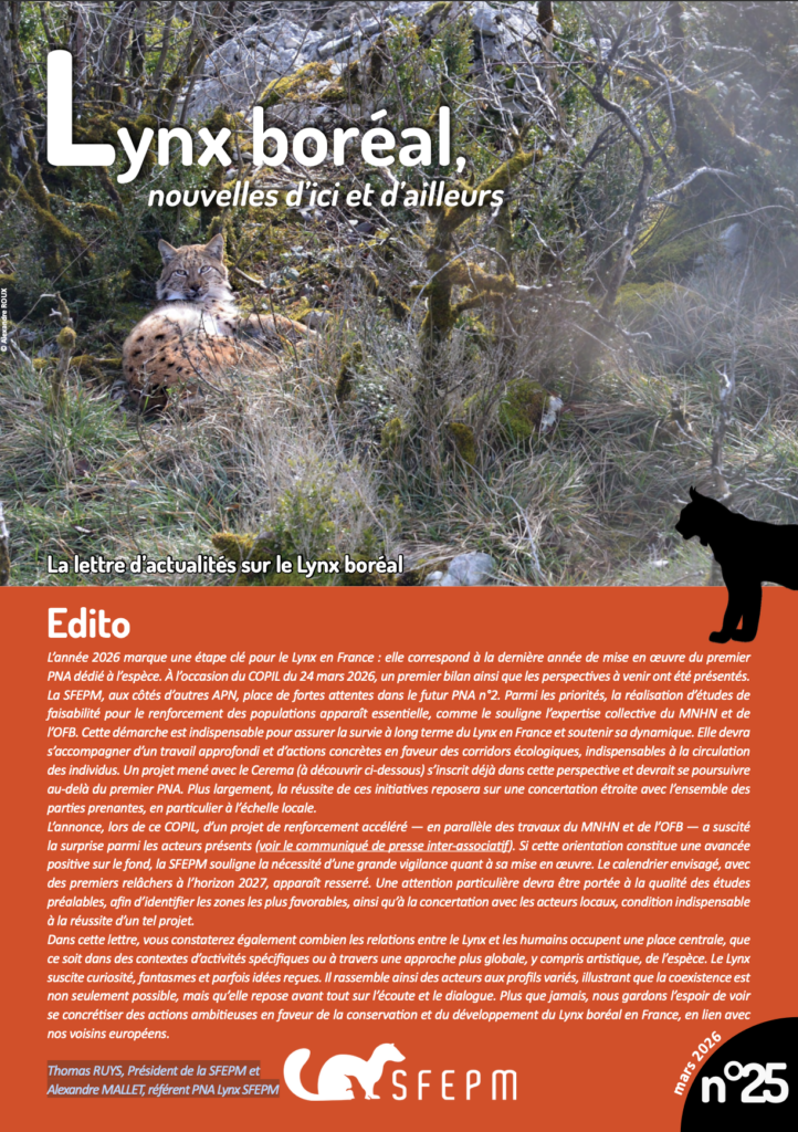 La nouvelle lettre d’actualités « Lynx boréal, nouvelles d’ici et d’ailleurs » n°25, éditée par nos amis de la SFEPM (Société Française d’Étude et de Protection des Mammifères) vient de paraître !