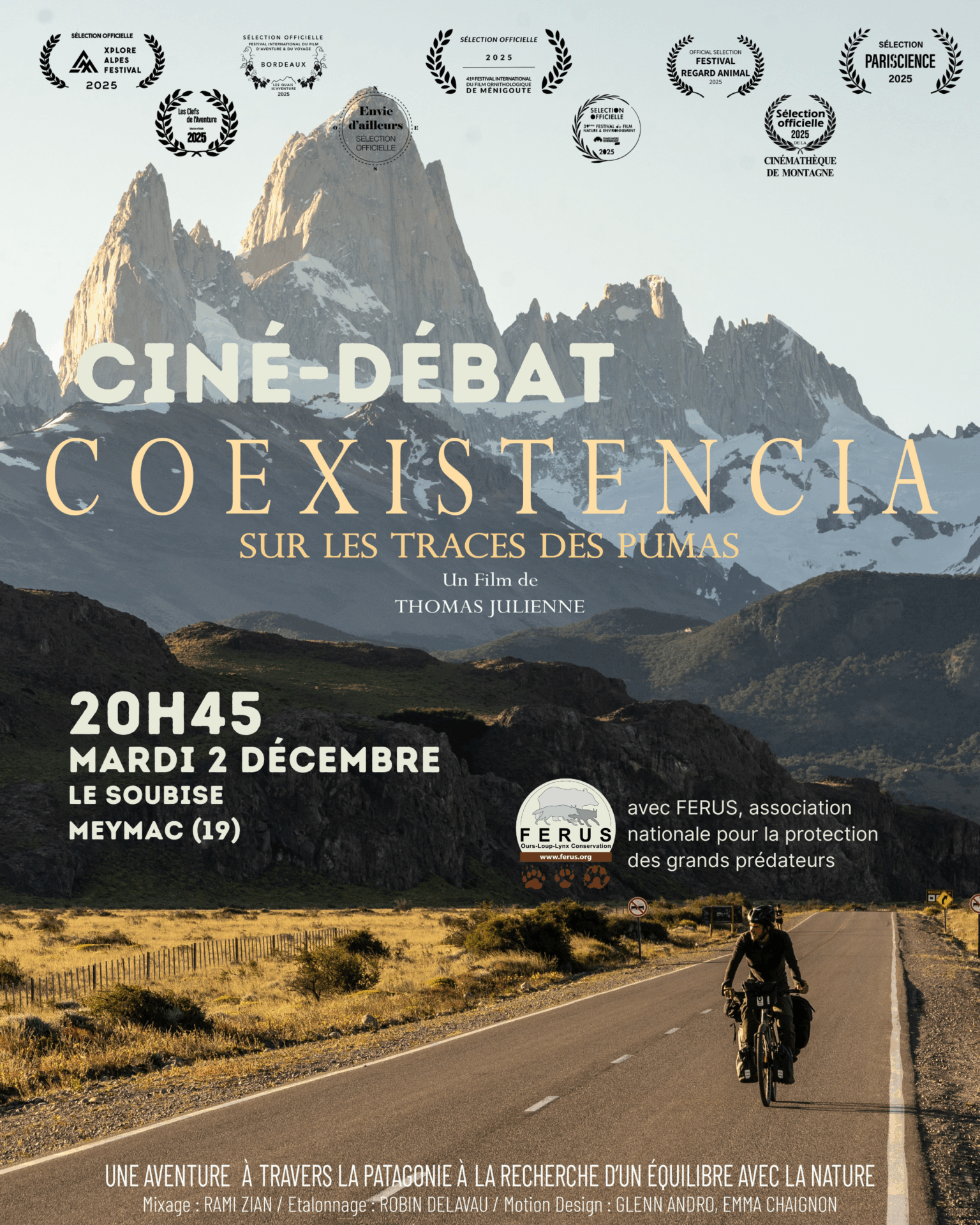 Retrouvez FERUS pour un ciné-débat autour du film de Thomas Julienne « Coexistencia, sur les traces des pumas », le mardi 2 décembre à 20h45. Rendez-vous au cinéma Soubise à Meymac (19) pour parler faune sauvage et coexistence !